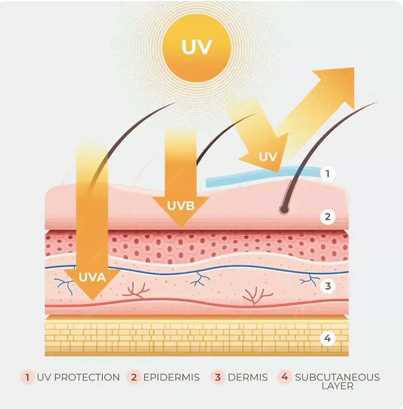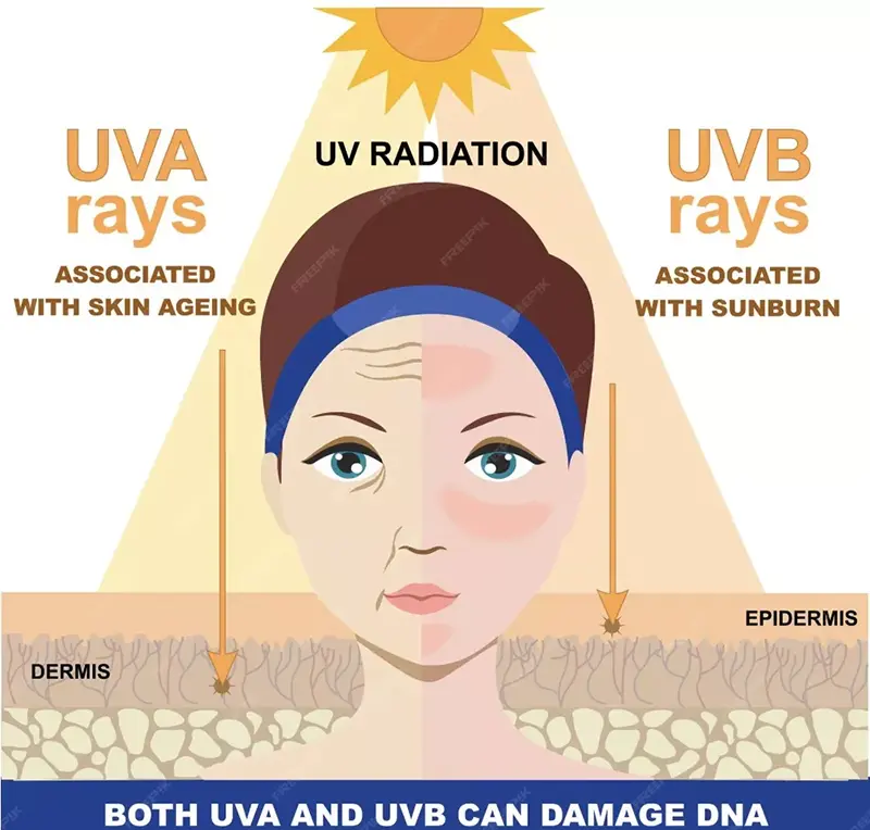 Ir UVA, ir UVB gali pažeisti odą, tačiau jų poveikis skiriasi daugiausia dėl prasiskverbimo gylio. Akivaizdu, kad turtingesnis UVA gali prasiskverbti giliau į dermą ir yra labiau susijęs su fotosenėjimu, nes gamins ROS ir skaidys kolageną bei elastiną, o tai sukels raukšles, odos elastingumo praradimą ir kitus priešlaikinio senėjimo požymius. Priešingai, UVB daugiausia veikia epidermį, sukeldamas saulės nudegimą (saulės eritemą) ir melanino gamybą trumpuoju laikotarpiu, o ilgalaikis poveikis gali sukelti hiperkeratozę ir žymiai padidinti odos piktybinių navikų riziką.