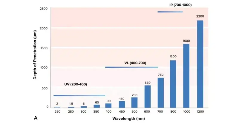 Kaip parodyta aukščiau esančiame paveikslėlyje, matoma šviesa turi didelę įtaką odai, nes ši juosta giliau įsiskverbia į odą. Raudona šviesa gali prasiskverbti per epidermį ir dermą ir pasiekti riebalų sluoksnį, nurodant ryšį tarp bangos ilgio ir prasiskverbimo gylio bei atvirkštinį ryšį tarp bangos ilgio ir energijos, o mėlyna šviesa turi didesnę energiją ir mažesnį prasiskverbimo gylį nei raudona šviesa.