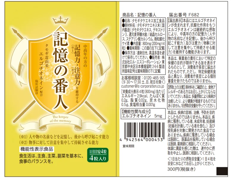 Japonijos LS korporacijos išleistas ergothioneino papildas yra produktas, skirtas vidutinio ir vyresnio amžiaus žmonių atminties pablogėjimui spręsti.