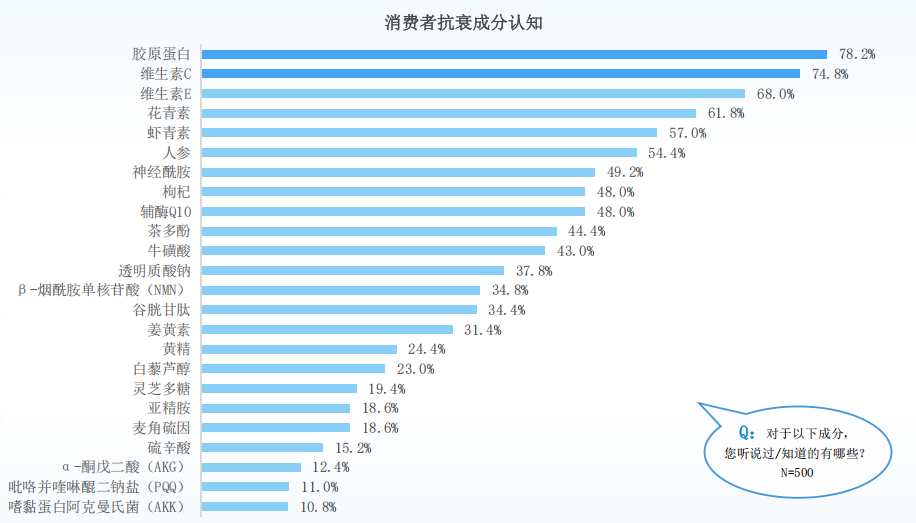 Dėl rinkos švietimo ir plėtros kolagenas šiuo metu yra labai pripažintas „anti-senėjimo ingredientas“ tarp vartotojų. Apklausoje apie pagrindinių senėjimą stabdančių ingredientų supratimą, kolagenas (78,2 %), vitaminas C (74,8 %) ir vitaminas E (68 %) yra trys pagrindiniai ingredientai, kuriuos vartotojai atpažįsta gamindami geriamuosius senėjimą stabdančius produktus. Tarp 5 geriausių anti-senėjimo ingredientų suvokimo įvairiose amžiaus grupėse kolagenas neabejotinai yra „žvaigždžių ingredientas“.